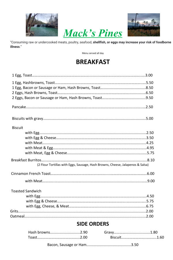 Welcome to Mack's Pines located in the Ozark National Forest. We have a Cozy Café and a convenience